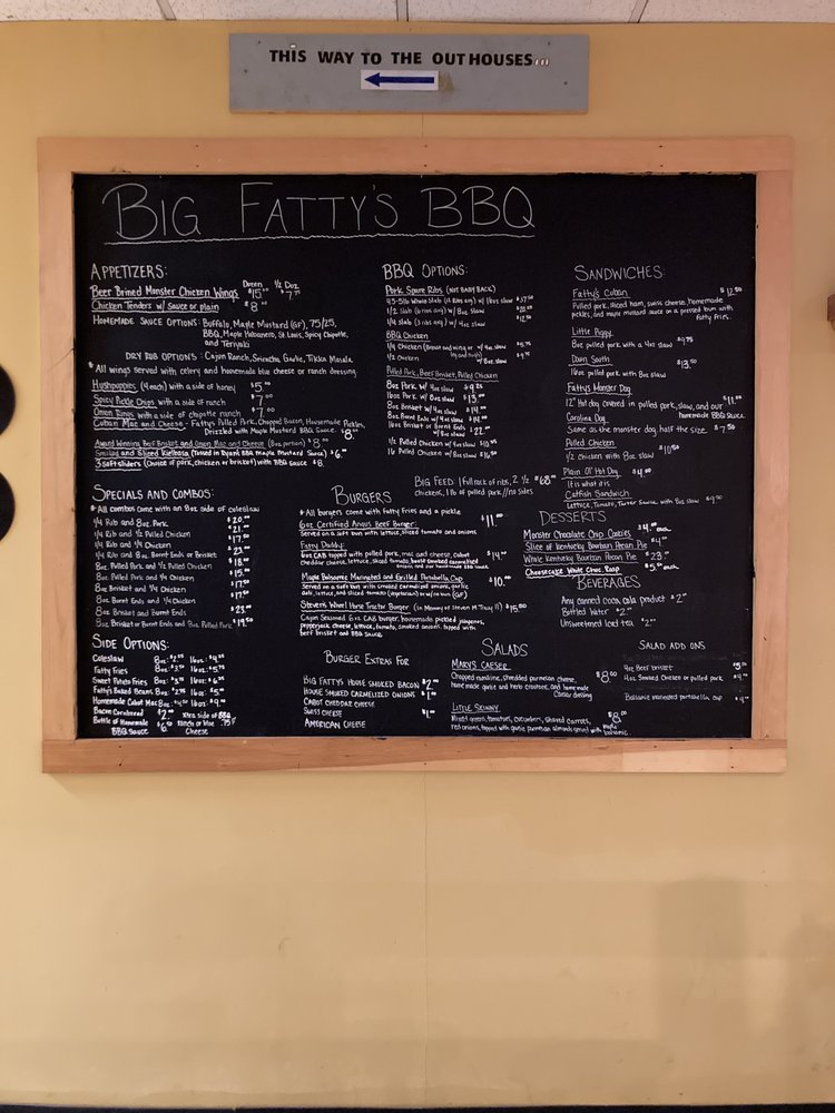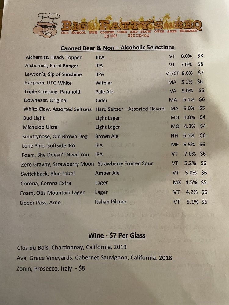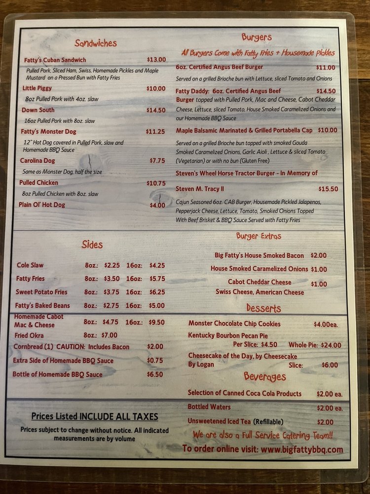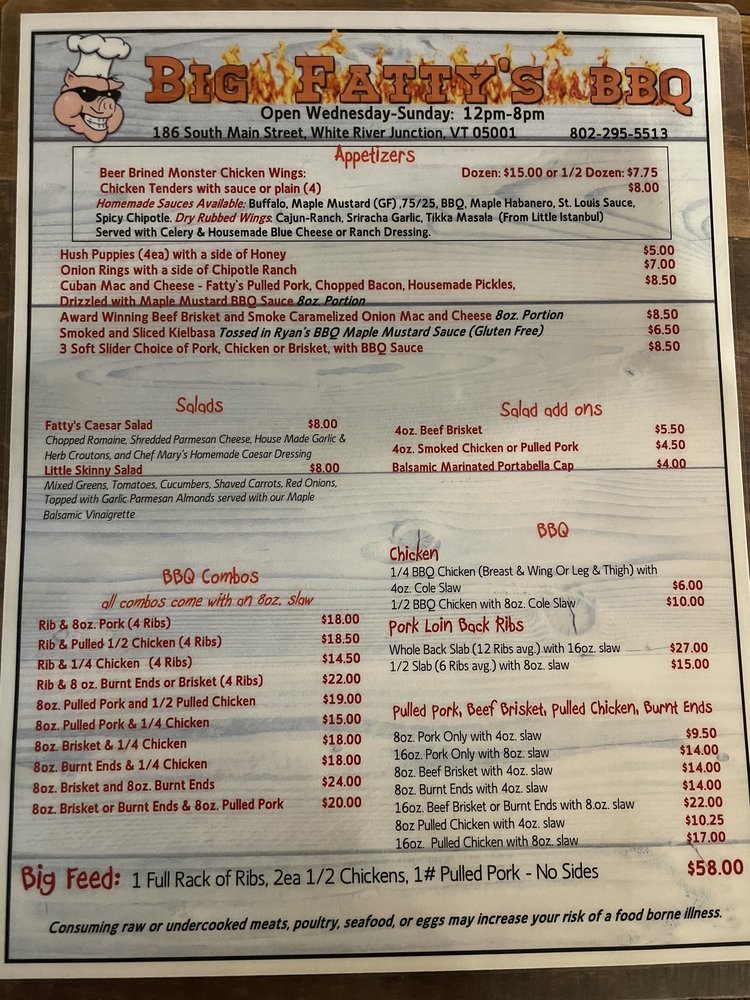 Introducing the menu at Big Fatty's BBQ in White River Junction, VT. The restaurant offers a variety of BBQ options including 1/2 BBQ Chicken, Beef Brisket, Pork Ribs, Brisket Sliders, and Monster Chicken Wings. Customers rave about the tender and flavorful meats, delicious side dishes, and unique BBQ sauces available. The atmosphere is lively with live music on weekends, attentive staff, and a diverse beer selection. Overall, Big Fatty's BBQ is a must-try for BBQ lovers looking for a fun and satisfying dining experience. Explore their menu for a taste of true American BBQ goodness.