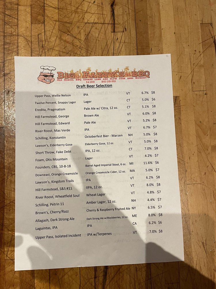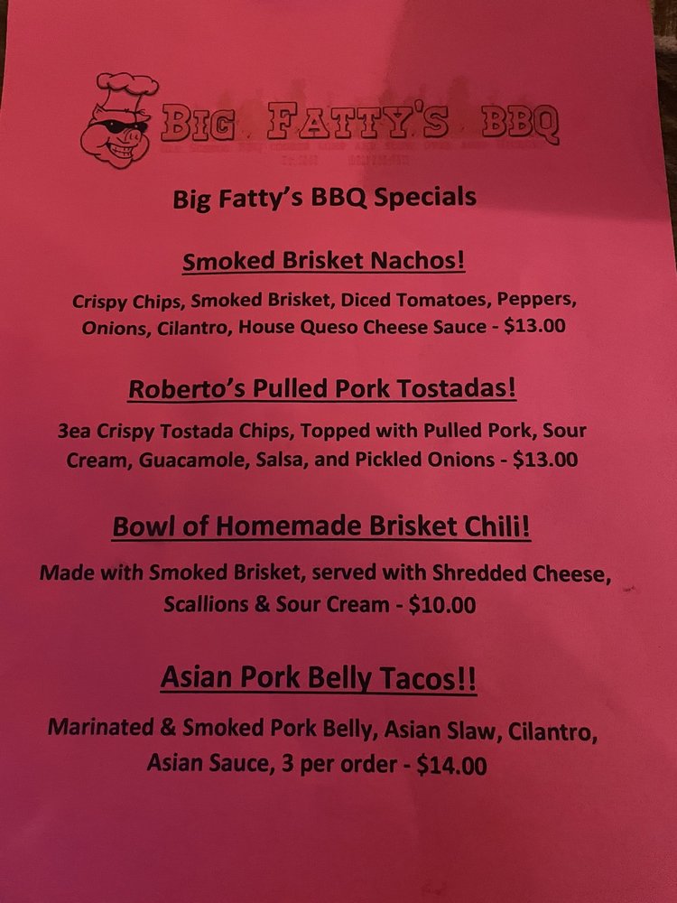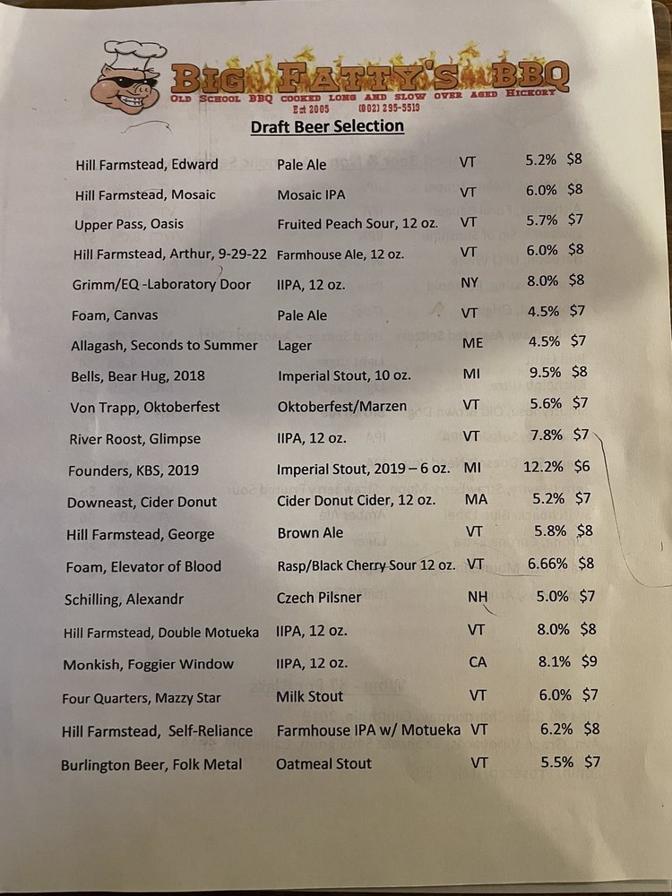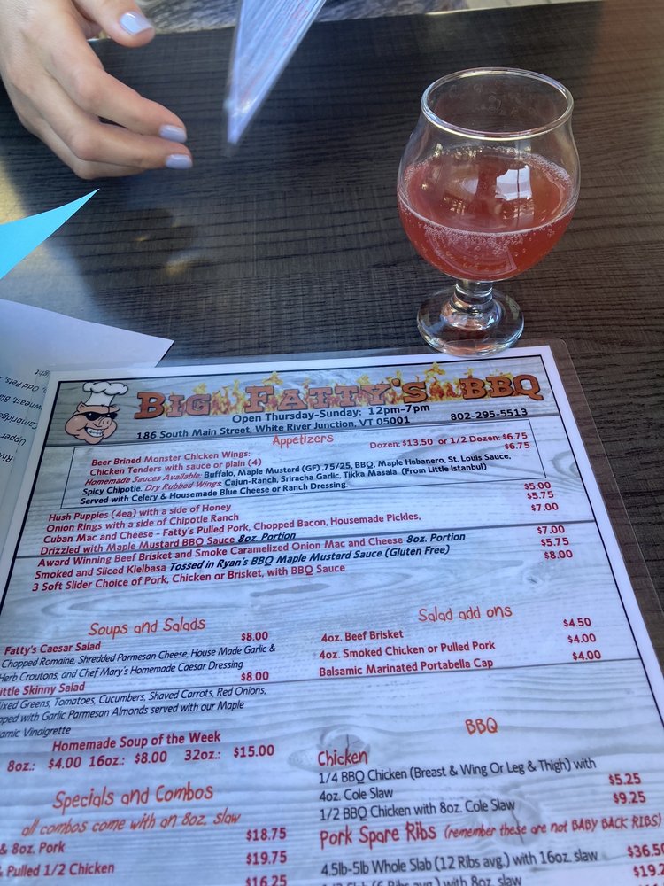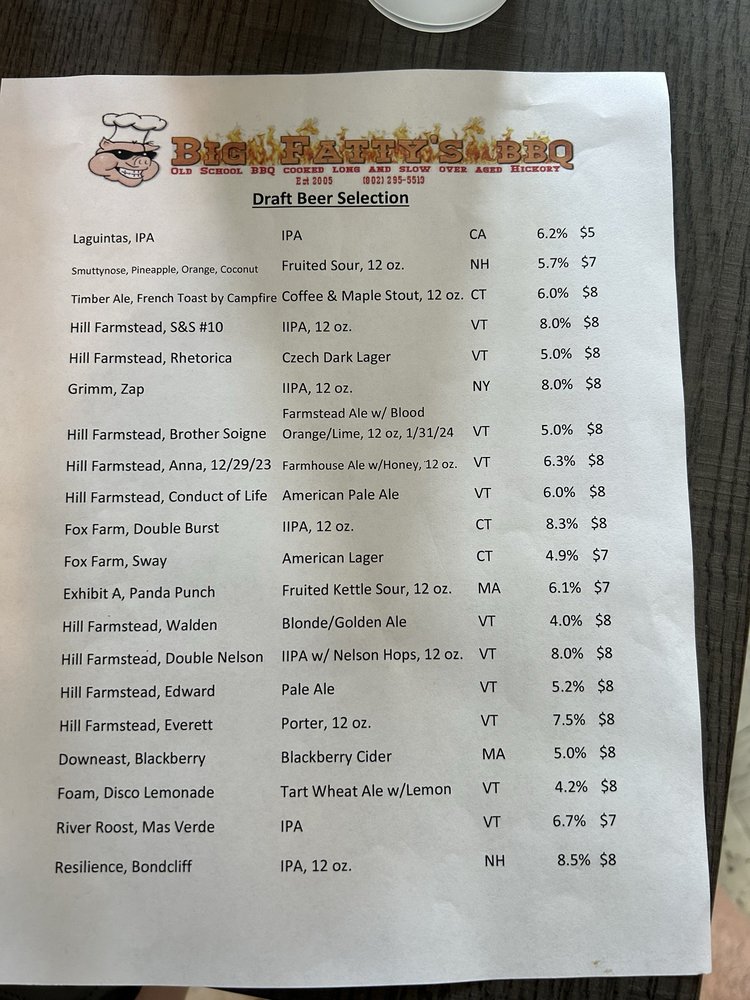 Introducing the menu at Big Fatty's BBQ in White River Junction, VT. The restaurant offers a variety of BBQ options including 1/2 BBQ Chicken, Beef Brisket, Pork Ribs, Brisket Sliders, and Monster Chicken Wings. Customers rave about the tender and flavorful meats, delicious side dishes, and unique BBQ sauces available. The atmosphere is lively with live music on weekends, attentive staff, and a diverse beer selection. Overall, Big Fatty's BBQ is a must-try for BBQ lovers looking for a fun and satisfying dining experience. Explore their menu for a taste of true American BBQ goodness.